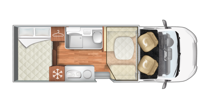 Regulowane na wysokość łóżko poprzeczne umożliwia znaczne powiększenie garażu na przykład do przewozu rowerów. 140-litrowa lodówka i ogrzewanie Truma.